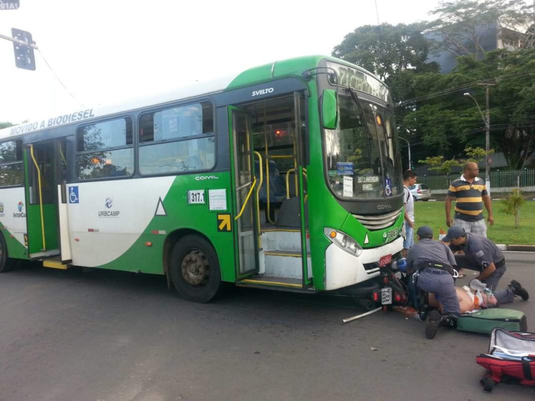 Um motociclista ficou ferido na manhã desta terça-feira depois de ser atingido por um ônibus do transporte coletivo de Campinas. O acidente aconteceu por volta das 7h30 no cruzamento das avenidas Luiz Smânio e Brasil, quando o tráfego era bastante intenso no local.