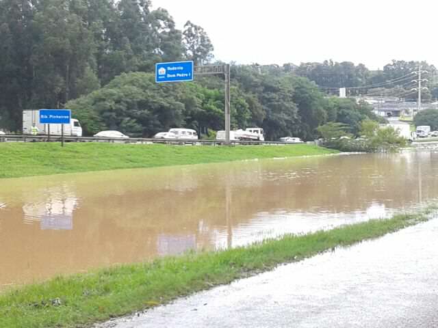 Os motoristas que trafegam pela Rodovia D. Pedro I, na altura do Km 122, em Valinhos, devem redobrar a atenção. Houve transbordamento do Rio Atibaia. O Ribeirão dos Pinheiros, afluente do Atibaia, subiu e acabou alagando os dois sentidos da rodovia. Para quem segue no sentido Campinas, a faixa da direita foi interditada. Por enquanto, é possível transitar nos dois sentidos.