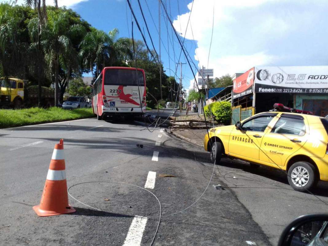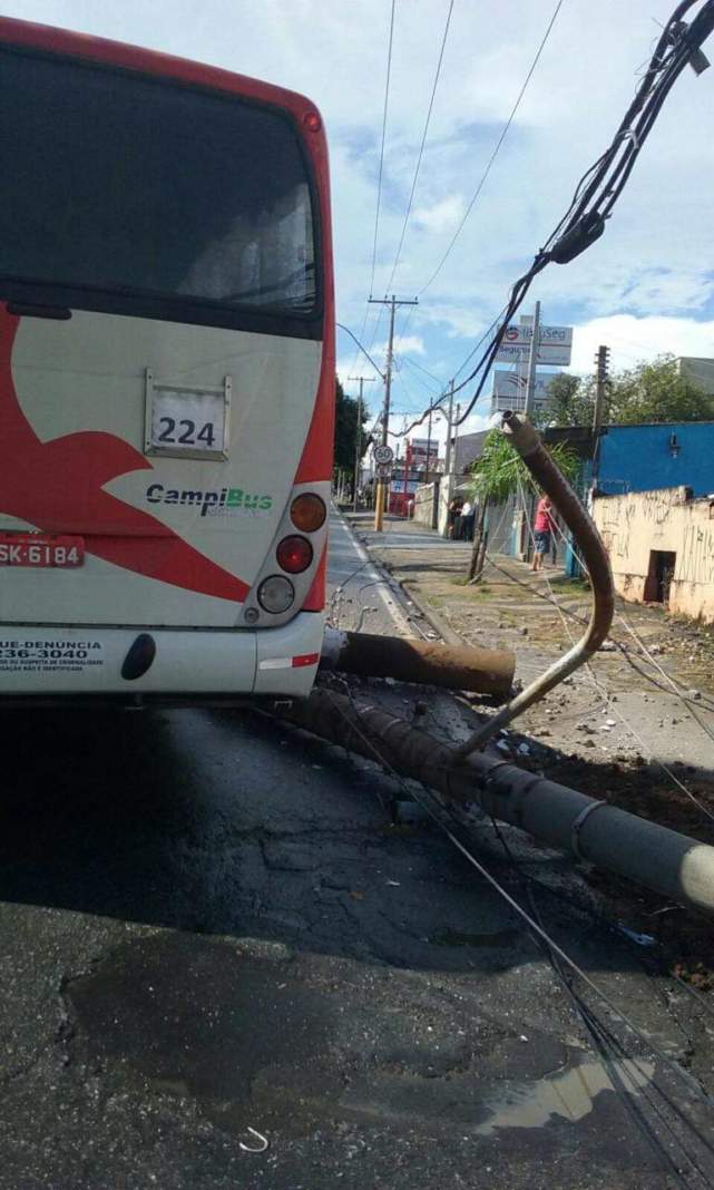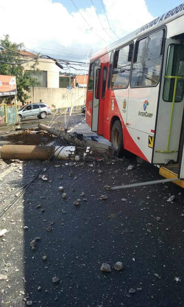 Um ônibus do transporte coletivo de Campinas que faz a linha 2.24 – Res. Sirius bateu em um poste, na tarde desta sexta-feira, na Vila Teixeira. O acidente ocorreu no cruzamento da Rua Cadete João Teixeira com Avenida Barão de Monte Alegre.