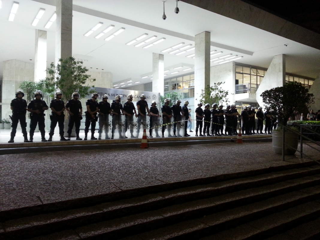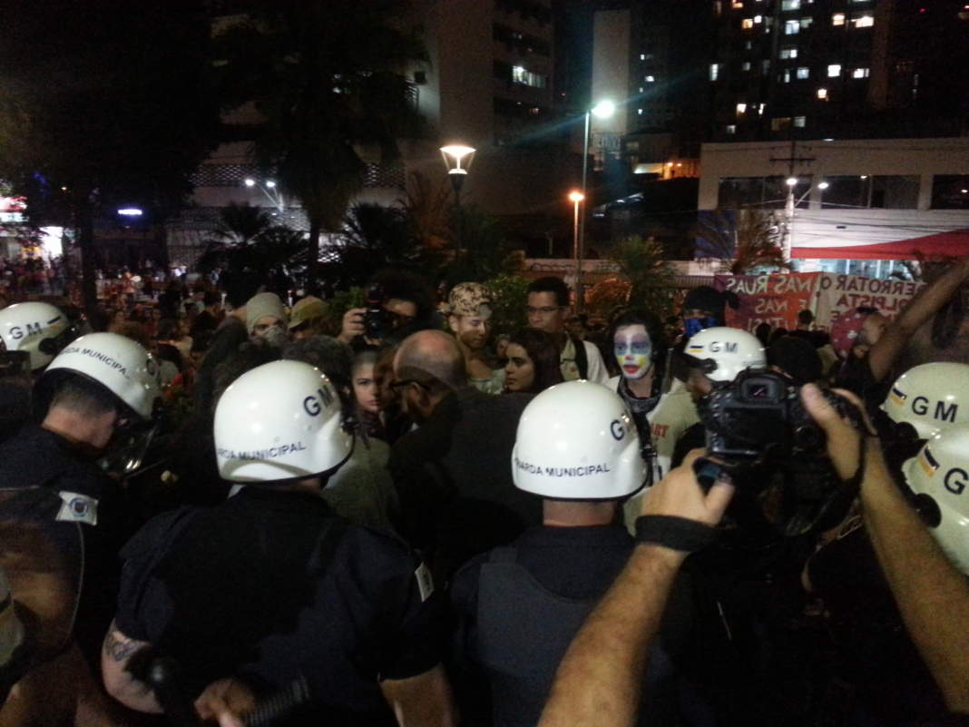 Um cordão de isolamento feito por Guardas Municipais separou o grupo da entrada do paço. Policiais militares também acompanharam toda a manifestação. O clima ficou tenso por várias vezes já que um pequeno grupo do total de manifestantes insistia em querer subir as escadarias.