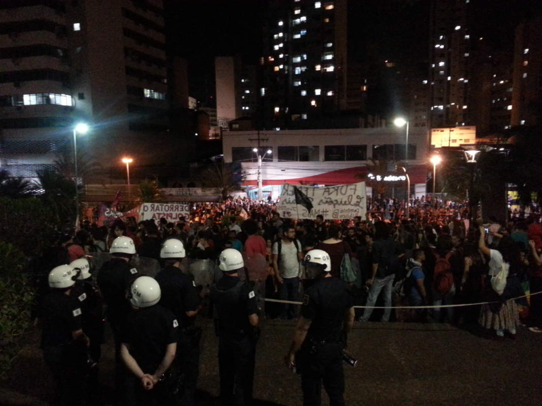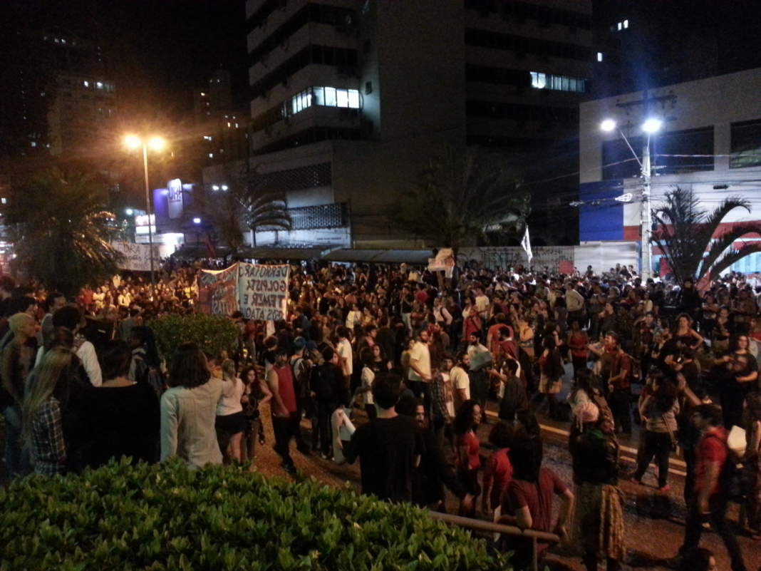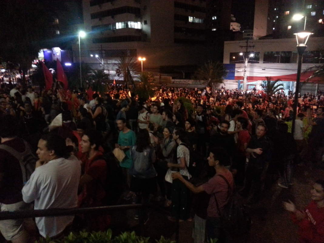 Depois de percorreram as vias os manifestantes se concentraram nas escadarias do paço municipal da prefeitura ocupando também as duas pistas da avenida Anchieta.