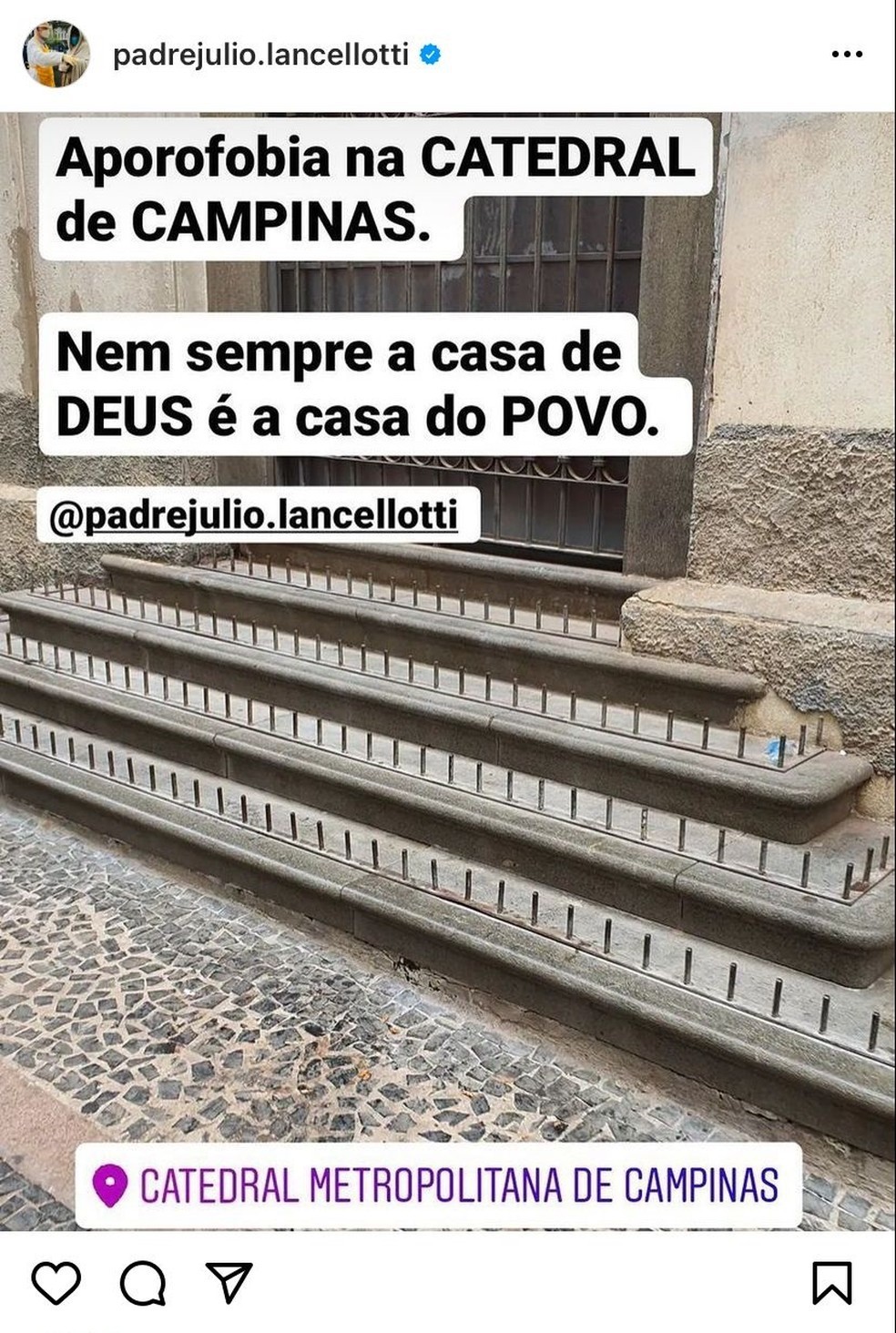 Após críticas de padre paulistano, Catedral anuncia retirada de obstáculosA postagem acabou sendo deletada pelo próprio padre Júlio Lancellotti, após ele receber uma ligação do pároco da Catedral de Campinas, explicando que apenas um dos acessos estava com os obstáculos.