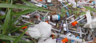 Agulhas, seringas, ampolas e hastes de algodão foram descartadas na calçada da Avenida Ruy Rodriguez,...