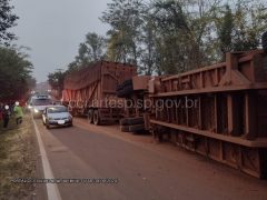 Um caminhão bitrem carregado com 28 toneladas de cana-de-açúcar tombou na madrugada desta quinta-feira na...