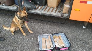 Dois cães farejadores do 1º BAEP da Polícia Militar de São Paulo identificaram uma mala...