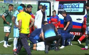 O meia Régis, do Guarani, precisou deixar o gramado de ambulância após ser atingido na...