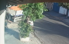 Um caminhão carregado com centenas de tijolos perdeu o freio e atingiu, de ré, uma...