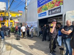 Vigilantes estão reunidos no Mercado Municipal de Campinas realizando uma manifestação para reivindicar pagamentos atrasados. ...