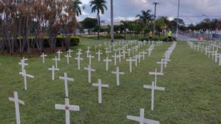 Cerca de 400 cruzes de madeira foram colocadas em um gramado em frente ao Paço...